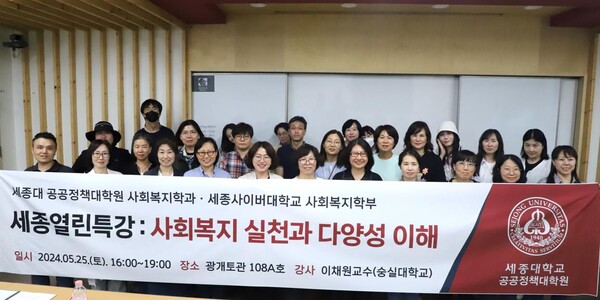 특강에 참여한 세종대 공공정책대학원 이민선 대학원생은 "이번 특강을 통해 사회복지에서 다양성 문제는 우리가 만나는 대상자의 삶의 기회의 차이와 불평등을 야기할 수 있다는 점을 알게 됐다. 이를 바탕으로 우리가 만나는 이들의 다름이 차별이 되지 않도록 공통점을 찾고 그들을 돕는 사회복지사로 일하겠다"고 말했다.
