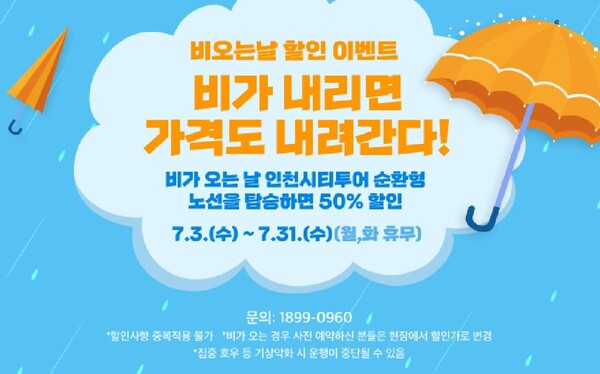7월 중 비오는 날 인천시티투어 순환형 노선을 이용하는 탑승객 대상으로 ‘비오는 날 할인 이벤트’를 진행하며, 7월 17일(수)부터 7월 19일(금) 3일 동안은 대한민국 헌법 제정의 날인 ‘제헌절’을 함께 기념하기 위해 탑승객 대상으로 순환형 노선을 80% 할인한다.