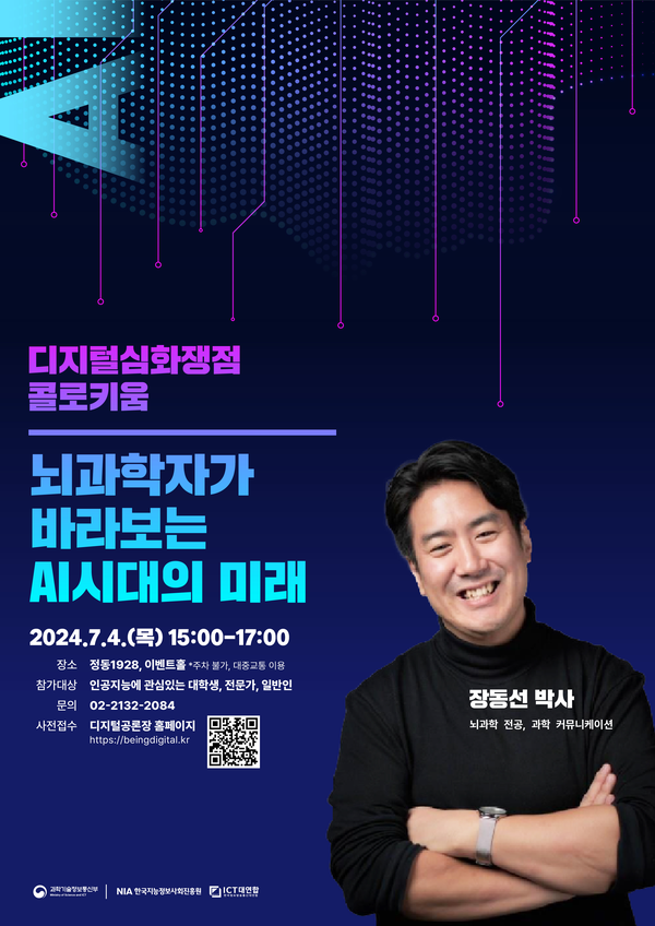 이번 콜로키움은 뇌과학자이자 과학 인플루언서인 장동선 박사가 뇌과학자 시각에서 보는 인공지능 일상화의 영향과 미래를 주제로 강연을 시작하며, 참여한 시민들과 함께 인공지능 시대에 마주하는 새로운 쟁점, 이를 해결하기 위한 정부의 노력으로서 ‘AI 서울 정상회의’ 성과, 글로벌 인공지능·디지털 규범 정립을 위한 앞으로의 역할에 대해 토론한다.