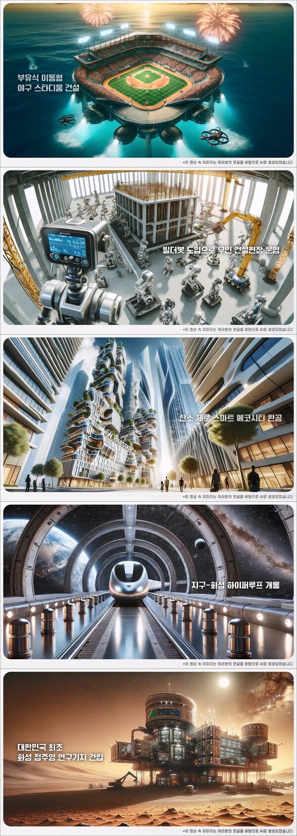 영상에 등장하는 AI 이미지는 총 10편으로 ▲화성 정주영 연구기지 ▲주거 복합 우주정거장 ▲지구-화성 하이퍼루프 ▲공중 테마파크 ▲해저 아파트 ▲스마트 에코시티 ▲심해 엘리베이터 등 고객의 자유로운 상상력과 새로운 혁신을 두려워 않는 현대건설의 기업정신이 오롯이 담겨 있다.