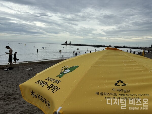 특히, 백사장에 노란 파라솔도 눈길을 끌었다. 바로 폐플라스틱으로 재활용해 만든 친환경 파라솔이다. 제작에는 제주특별자치도, 한국인력개발원, 제주시니어클럽, KB증권이 협업으로 제작해 백사장에서 50여개를 설치 제공했다.
