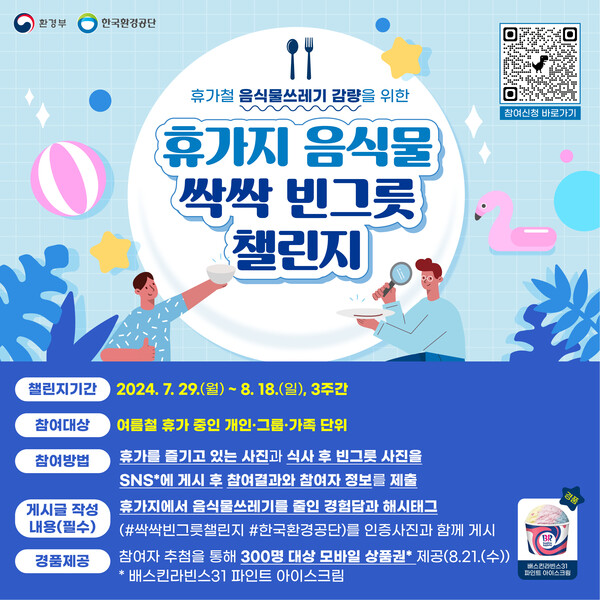 [디지털비즈온 이은광 기자] 환경부 산하 한국환경공단(이사장 안병옥)은 지난 가정의 달에 진행된 싹싹 빈그릇 챌린지에 이어서 이번 여름 휴가철에도 남김 없는 음식문화 조성을 위해 ‘휴가지 음식물 싹싹 빈그릇 챌린지’를 실시한다.
