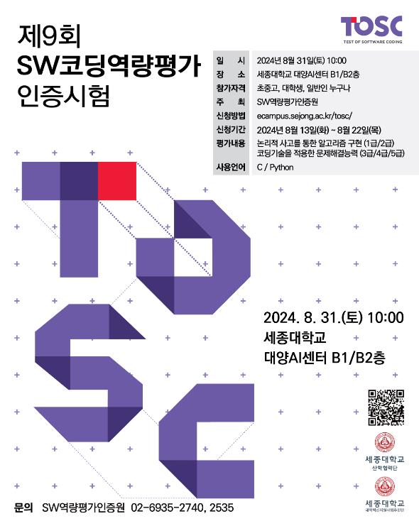 [디지털비즈온 이현주 기자] 세종대학교(총장 엄종화) 산학협력단 SW역량평가인증원은 오는 8월 31일(토) 오전 10시 세종대학교 대양AI센터에서 제9회 SW코딩역량평가(Test Of Software Coding, TOSC, 이하 ‘토스크’)를 개최한다.