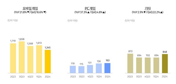 모바일 게임은 전년 동기 대비 약 22%, 전분기 대비 약 17% 감소한 약 1,345억 원의 매출을 기록했으며, PC온라인 게임은 전년 동기 대비 약 37%, 전분기 대비 약 5% 증가한 약 163억 원의 매출을 달성했다.