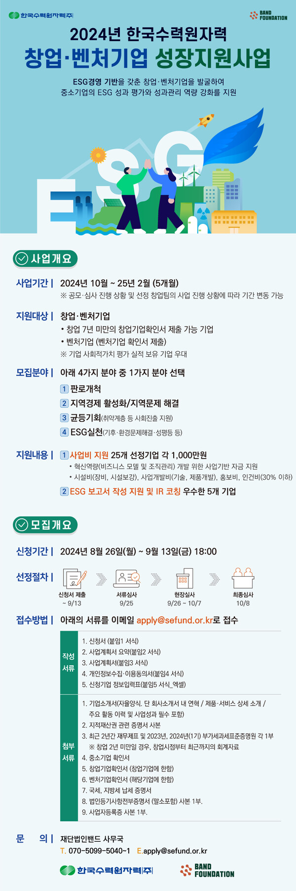 한수원은 8월 26일부터 9월 13일까지 ‘2024년 한국수력원자력 창업·벤처기업 성장지원사업’공모를 실시한다. 전국의 창업·벤처기업 중 ESG 경영 기반을 갖추고 성장이 기대되는 25개 社를 선정하여 사업비 각 1천만 원씩 총 2억 5천만 원을 직접 지원하고, 우수기업 5곳에는 내년 2월까지 IR 컨설팅 등 투자유치 역량을 높일 수 있도록 지원할 예정이다.