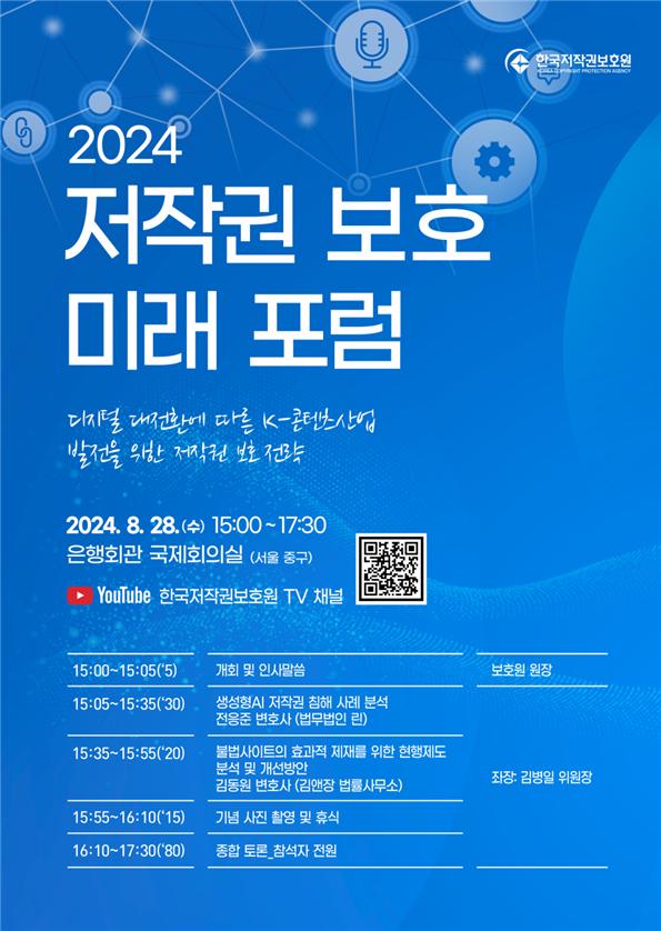 제4회 ‘2024 저작권 보호 미래 포럼’은 보호원 유튜브 채널(한국저작권보호원 TV)에서 실시간으로 중계되며, 포럼 후에는 보호원 누리집에서 영상을 확인할 수 있다. 올해 마지막 포럼인 제5회 ‘2024 저작권 보호 미래 포럼’은 11월 28일(목)에 개최될 예정이다.