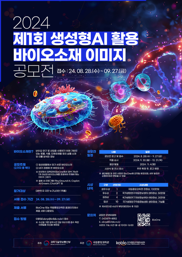 국립중앙과학관(관장 권석민, 이하 ‘과학관’)과 국가생명연구자원정보센터(센터장 정해영, 이하 ‘KOBIC’)는 생명공학 소재 관련 인공지능(AI) 이미지를 통해 생명공학 소재를 널리 알리고 활용을 확대하고자 ‘제1회 생성형 인공지능(AI) 활용 생명공학 소재 이미지 공모전’을 개최한다.