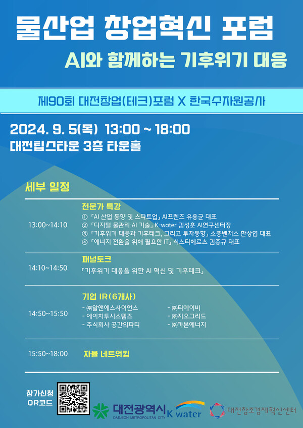 이 밖에도, 9월 5일 대학로99 소재 팁스타운에서 ‘물산업 창업혁신 포럼’을 개최한다. AI프렌즈 유용균 대표와 한국수자원공사 김성훈 AI 연구센터장의 인공지능(AI) 분야 특강, 소풍벤처스 한상엽 대표와 식스티헤르츠 김종규 대표의 기후위기 및 에너지 분야 특강과 함께 창업기업 및 투자사 등이 함께하는 ‘패널토크’가 순서대로 진행된다.