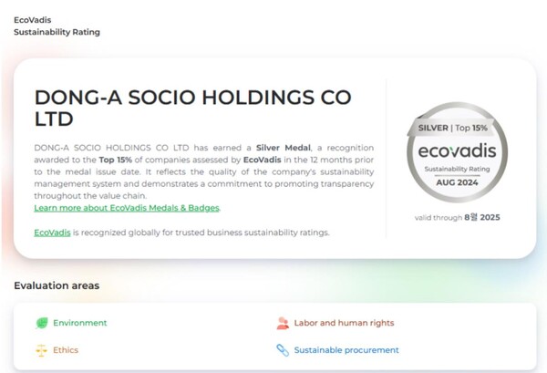 [디지털비즈온 이현주 기자] 동아쏘시오홀딩스(대표이사 사장 김민영)가 글로벌 ESG(환경, 사회, 지배구조) 평가 기관인 에코바디스(EcoVadis)로부터 실버 등급을 획득했다고 2일 밝혔다.