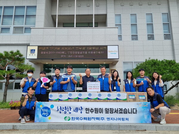 한국수력원자력(사장 황주호, 이하 한수원) 엔지니어링본부 엔지니어링처 직원들이 9일 경주 산내면 행정복지센터를 방문, 추석명절을 맞아 지역의 취약계층을 위해 총 200만 원 상당의 생필품을 전달했다. 생필품 구입에는 임직원들이 매월 자발적으로 모금한 ‘러브펀드’를 활용했다.