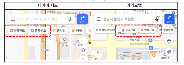 네이버, 카카오는 중앙응급의료센터로부터 추석연휴 기간 중 문 여는 병·의원 정보와 응급실 운영기관 정보를 제공받아 지도앱에서 해당 기관에 대한 안내 서비스를 제공한다. 이용자가 지도앱(네이버 지도, 카카오맵) 주요화면 상단에 나타나는 ‘명절진료’, ‘응급진료’ 탭을 클릭할 경우 내 주변에 있는 ‘추석연휴에 문 여는 병·의원’ 및 ‘응급실 운영기관’ 정보를 확인할 수 있다.