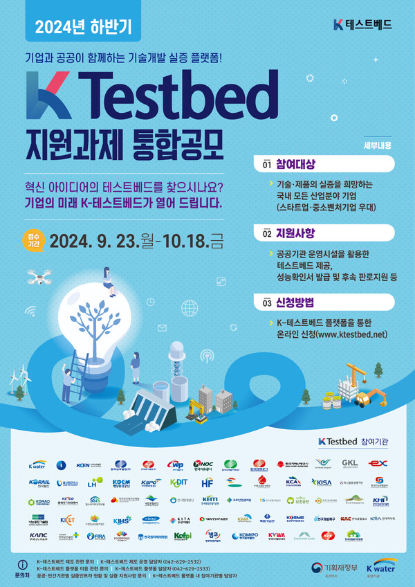 한국수자원공사(K-water, 사장 윤석대)는 혁신 기술을 보유한 국내 유망 스타트업과 중소·벤처기업의 육성을 위해 2024년 상반기 K-테스트베드 지원사업에 참여할 기업을 9월 23일부터 10월 18일까지 모집한다. K-테스트베드는 공공·민간이 보유한 시설과 설비 등 자원을 국내 모든 산업 분야의 스타트업 및 중소·벤처기업에 개방하여 혁신기술의 실증을 지원하는 사업으로, 2021년 기획재정부 주관으로 출범하였다. 한국수자원공사는 현재 64개 기관이 참여 중인 K-테스트베드 사업의 운영기관으로서 운영을 총괄하고 있다. 이번 모집 분야는 ▲ 연구·개발 ▲ 단순실증 ▲ 기술·제품 성능확인의 세 가지 분야이며, 참여를 희망하는 기업은 9월23일부터 K-테스트베드 공식 누리집(www.ktestbed.net)을 통해 공모 상세내용 확인 및 신청이 가능하다. 특히 올해 7월부터는 K-테스트베드 기술·제품 성능확인서를 발급받은 제품은 조달청 혁신 시제품 지정평가 시 인센티브(‘시범사용 수행역량’ 평가 만점)를 받을 수 있도록 「혁신제품 구매운영규정」이 개정되어, 실증 성과 우수제품에 대한 공공판로 지원이 강화되었다. 또한, K-테스트베드와 중소기업 기술마켓 간 연계로, K-테스트베드 성능확인서 발급 제품은 중소기업 기술마켓 인증제품 등록을 통해 공공판로와 제품 홍보도 지원받을 수 있다. 안정호 한국수자원공사 그린인프라부문장은 “K-테스트베드를 통해 국내 스타트업, 중소·벤처기업이 필요로 하는 연구개발 및 제품의 실·검증 지원을 넓혀가고, 이를 바탕으로 우수성이 입증된 기술은 국내외 판로개척도 적극 지원하는 등 국내 물산업의 혁신 생태계 조성에 앞장서겠다”라고 밝혔다. |