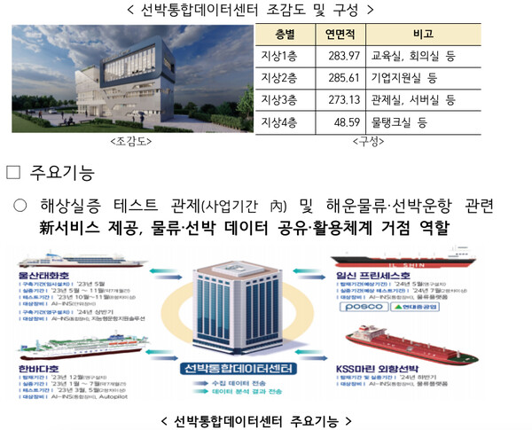 향후 통합데이터센터는 운항 중인 선박의 위치, 항로, 연료량 등 다양한 상태 데이터를 육상에서 실시간 점검하고 선박의 안전하고 경제적인 항해를 지원하는 ‘통합관제 해결책(솔루션)’, 물류의 실시간 정보를 기반으로 선박에 화물을 효율적으로 적재‧배치하고 입출항 일정잡기를 시험하는 ‘물류 최적의사결정 지원 서비스’ 등 동 사업의 결과물을 활용한 디지털 신(新)서비스를 제공하는 핵심 거점기능을 수행할 예정이다.