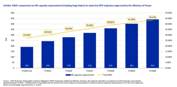 정부의 계획에 따르면 RPO 비율은 2023년 24.3%에서 2030년 43.3%까지 늘어나야 한다. ICRA는 2030 회계연도까지 44.3% RPO 목표에 달성하기 위해 인도의 현재 재생에너지 용량(약 200GW)을 441GW로 두 배 이상 확대해야 하며, 이를 위해 에너지 저장, 전력망 통합 및 송전 인프라 확충과 같은 주요 투자와 과제가 필요하다고 밝혔다.