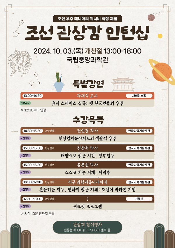 권석민 국립중앙과학관장은 “관상감은 조선시대 우주와 과학을 사랑하던 사람들이 가장 일하고 싶어 하던 직장”이라며, “‘관상감 직무실습’이라는 특별한 주제로 기획된 이번 행사를 통해, 조선시대 과학자가 되어 우주와 과학을 바라볼 수 있는 기회가 되길 바란다”고 전했다.