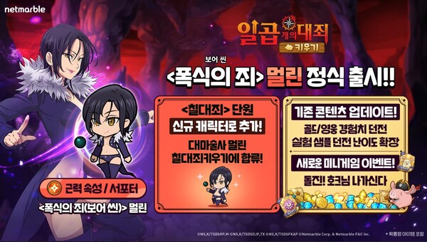 [디지털비즈온 이현주 기자] 넷마블(대표 권영식, 김병규)은 신작 모바일 캐주얼 RPG <일곱 개의 대죄 키우기(개발사 넷마블에프앤씨)>에 신규 캐릭터 ‘<폭식의 죄> 멀린’을 추가하는 등 업데이트를 실시했다고 8일 밝혔다.