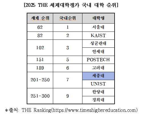 세종대는 작년에 비해 국내 순위에서는 한 계단 상승한 7위, 세계 순위에서는 251-300위에서 201-250위로 상승했다.