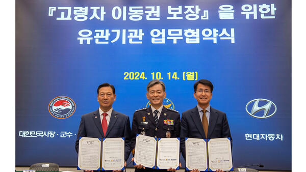 현대자동차가 14일(월) 서울시 서대문구에 위치한 경찰청사에서 경찰청, 대한민국시장·군수·구청장협의회와 ‘고령자 이동권 교통안전 및 이동권 보장을 위한 다자간 업무 협약’을 체결했다고 밝혔다.