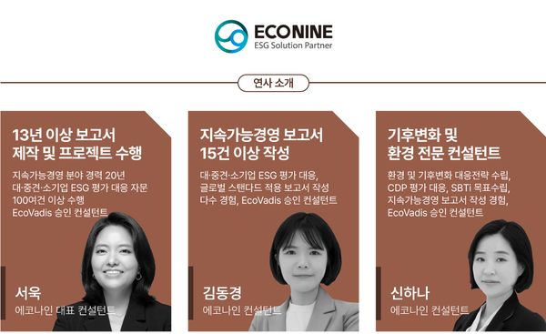 김동경 시니어 컨설턴트는 대중소 ESG 평가 대응, 글로벌 스탠다드 적용 보고서와 지속가능경영보고서 작성 다수의 경험자다.
