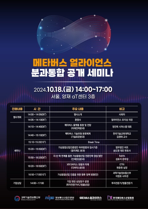 [디지털비즈온 이은광 기자] 메타버스 얼라이언스(의장 유지상) 사무국(한국메타버스산업협회)은 오는 10월 18일(금) 오후 2시 서울 양재 aT센터 3층 전시장에서 ‘메타버스 얼라이언스 분과통합 공개세미나’를 개최한다고 밝혔다.