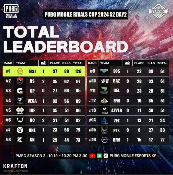 하루 6매치씩 총 12개의 매치를 치른 결과, 한국의 미래엔세종이 총 1치킨, 126포인트로 대회 우승을 차지했다. 미래엔세종은 1일 차 44포인트로 5위에 머물렀으나, 2일 차 3개 매치에서 무려 63포인트를 쓸어 담는 무서운 집중력을 발휘하며 1위에 올라섰다.