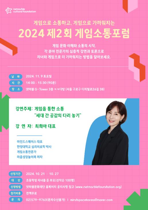 올해 마지막으로 열리는 이번 포럼은 오는 11월 9일 넷마블 지타워에서 진행되며, 마인드스페이스 최희아 대표가 ‘게임을 통한 소통 “세대 간 공감의 다리 놓기”’를 주제로 강연에 나선다.