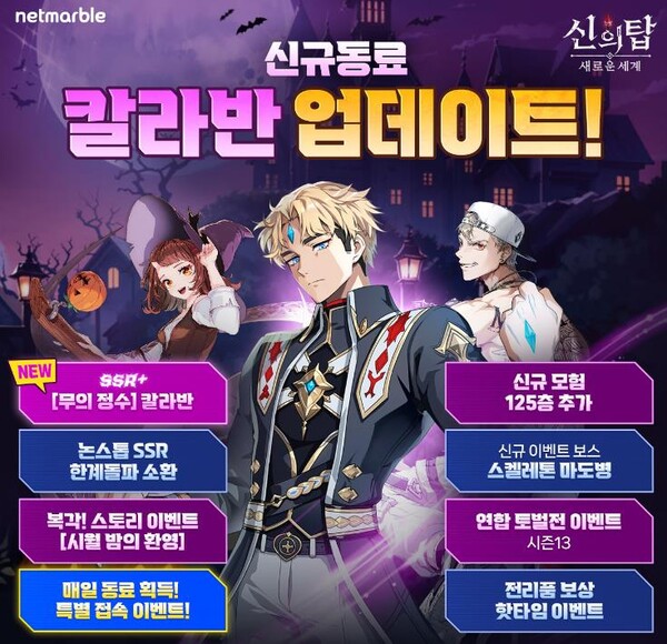 [디지털비즈온 이현주 기자] 넷마블(대표 권영식, 김병규)은 수집형 애니메이션 RPG <신의 탑: 새로운 세계>(개발사 넷마블엔투)에 신규 SSR+ 동료 '[무의 정수] 칼라반'을 업데이트했다고 23일 밝혔다.