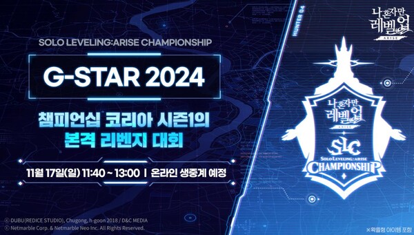 넷마블(대표 권영식, 김병규)은 오는 11월 17일 부산 벡스코에서 ‘나 혼자만 레벨업:어라이즈 챔피언십 G-STAR 2024’를 개최한다고 밝혔다.