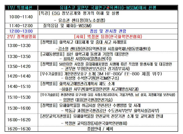 또한 한국환경공단 수도권서부본부 박동규 과장이 ‘유해화학물질 취급시설 안전진단 수행방법 및 사례’발표에 이어 (사)한국화학안전협회 박정현 교육팀장이 유해화학물질 안전교육 전문기관 소개 및 교육과정에 대해 안내한다.