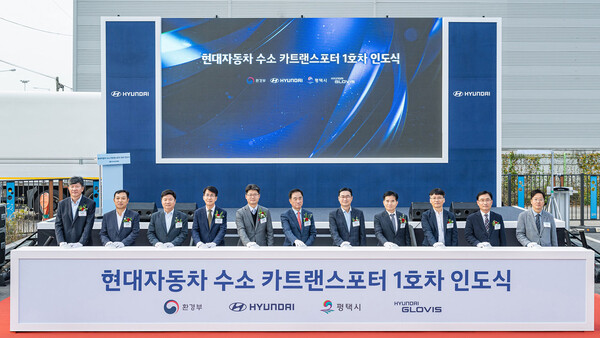 현대자동차는 28일(월) 평택항 수소교통복합기지 일대에서 현대자동차 국내사업본부장 정유석 부사장, 현대자동차 전략기획실장 김동욱 부사장, 환경부 대기환경정책관실 오일영 정책관, 정장선 평택시장, 더불어민주당 홍기원 국회의원(경기 평택갑), 더불어민주당 이병진 국회의원(경기 평택을), 현대글로비스 SCM사업부장 조삼현 상무 등이 참석한 가운데 ‘엑시언트 수소전기트럭 카트랜스포터’(이하 엑시언트 수소 카트랜스포터) 1호차 인도식을 가졌다.