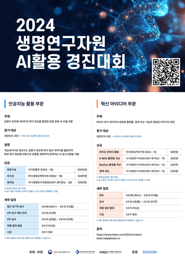과학기술정보통신부(장관 유상임, 이하 ‘과기정통부’)는 생명연구자원의 공유와 활용에 대한 국민의 인식을 높이기 위해 8월 28일(수)부터 10월 28(월)까지 진행한「2024년 생명연구자원 인공지능 활용 경진대회」의 수상자를 선정하였다고 밝혔다.