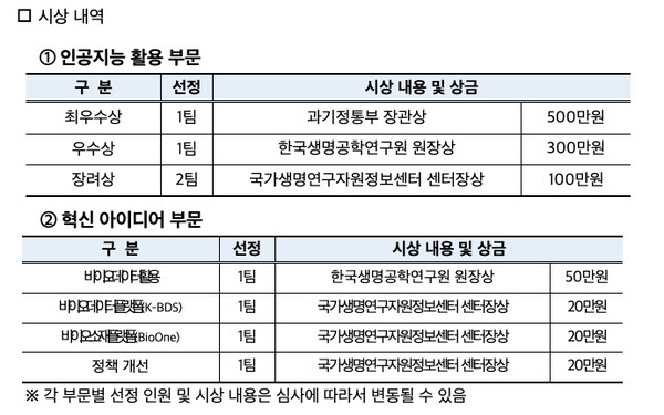 최우수상인 과학기술정보통신부 장관상에는 ‘ti-esti(한국과학기술원)’, 우수상인 한국생명공학연구원장상에는 ‘dalcw’(전남대학교), 장려상인 국가생명연구자원정보센터장상에는 ‘푹신한이불(한국과학기술원)’과 ‘GIGO(국민대학교, 중앙대학교)’ 2개 단체가 선정되었으며, 상장과 함께 최우수상은 500만 원, 우수상은 300만 원, 장려상은 100만원의 상금도 수여된다.