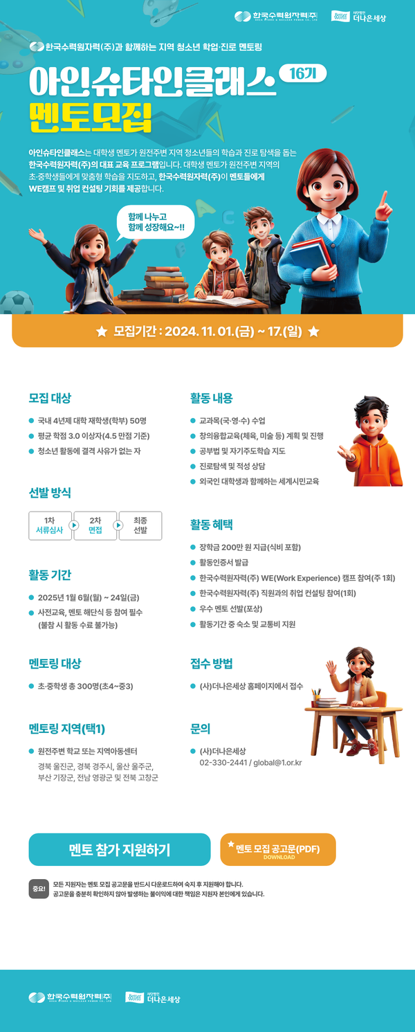 한국수력원자력(사장 황주호, 이하 한수원)이 ‘아인슈타인클래스’ 멘토(50명)와 멘티(300명)를 모집한다.