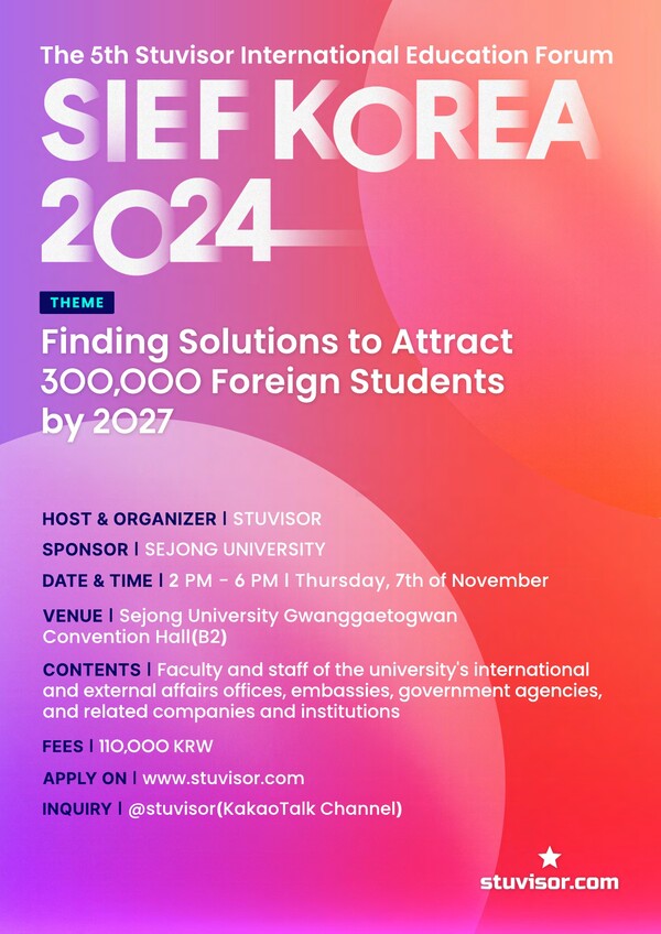 세종대학교(총장 엄종화)는 스튜바이저(Stuvisor, 대표 양길준)와 공동으로 오는 11월 7일(목) 오후 2시부터 6시까지 세종대학교 광개토관에서 '제5회 스튜바이저 국제교육포럼'을 개최한다.