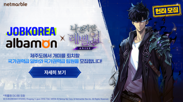넷마블(대표 권영식, 김병규)은 액션 게임 <나 혼자만 레벨업:어라이즈>(개발사 넷마블네오)가 대표 커리어 플랫폼 잡코리아, 알바몬과 협업을 통해 오는 12월 업데이트 예정인 ‘제주도 레이드’에 참가할 헌터를 공개모집 한다고 8일 밝혔다.