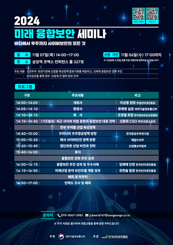 과학기술정보통신부(장관 유상임, 이하 ‘과기정통부’)는 한국인터넷진흥원(원장 이상중, 이하 ‘KISA’), 한국정보보호산업협회(회장 조영철, 이하 ‘KISIA’)와 함께 우주, 선박, 로봇 등 미래 전략산업 분야에 대한 전방위적 보안 강화 성과를 공유할 수 있는 발표회를 11월 7일(목) 서울 코엑스에서 개최했다고 밝혔다.