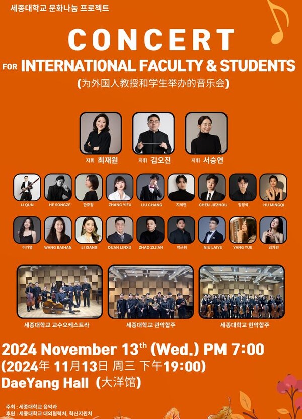 세종대학교(총장 엄종화) 음악과는 세계 속의 글로벌 세종의 이미지를 높이고 캠퍼스 안에서 내외국 교수진과 학생들이 함께 즐길 수 있는 음악회를 오는 11월 13일(수) 오후 7시 대양홀에서 개최한다.