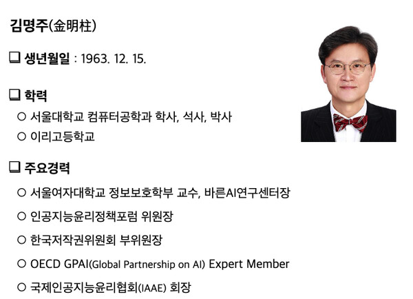 김명주 초대소장은 컴퓨터공학을 전공한 인공지능 윤리‧신뢰성 전문가로, 바른 인공지능(AI) 연구센터장(RAISE, ‘19~), 국제 인공지능(AI) 윤리협회장(’24~), ‘인공지능 윤리정책토론회(포럼)’ 위원장(’23) 등을 맡으며 안전하고 책임있는 인공지능 개발·활용 확산을 위해 노력해 왔다.