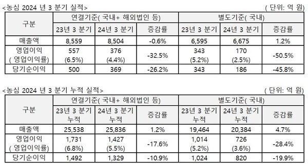 농심은 2024년 3분기 연결기준 매출액 8504억 원, 영업이익 376억 원을 기록했다고 14일 공시했다. 전년 동기 대비 매출액은 0.6% 감소하고, 영업이익은 32.5% 감소했다. 영업이익률은 4.4%를 기록했다.