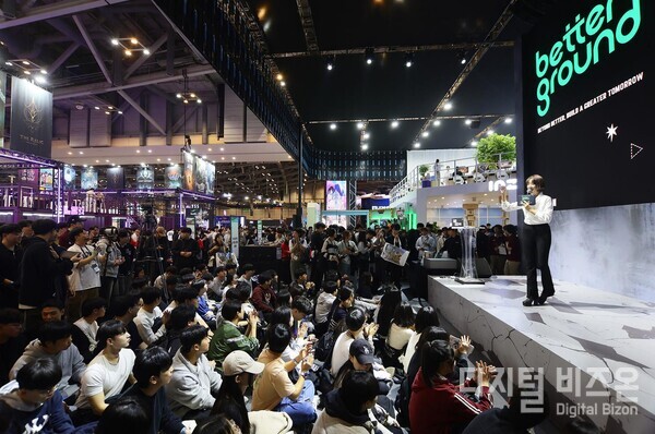 크래프톤 정글의 철학을 이해할 수 있는 참여형 콘텐츠로 구성된 야외 부스를 운영 중이다. 14일과 15일 크래프톤 부스에서 'BETTER GROUND(베터그라운드)' 2기 참가자들의 게임 프로젝트 발표가 진행됐다.