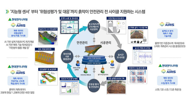 현대엔지니어링은 안전관리분야에 협력사 스마트아이리스와 함께 개발한 ‘AIoT 기술을 융합한 스마트 흙막이 계측관리 시스템’을 출품했다. 이는 AI 기술을 활용해 미계측구간 및 미시공구간에 대한 과학적 예측을 통해 보이지 않는 위험요소에 선제적 대응이 가능하도록 하는 시스템이다.