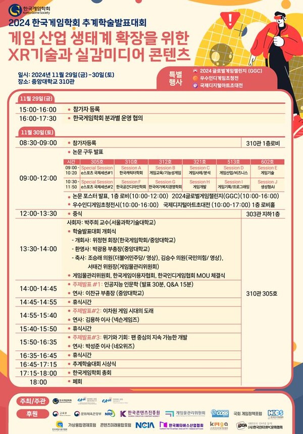 이번 학술발표대회는 “XR 기술과 실감미디어 콘텐츠를 통한 게임 산업 생태계 확장”이라는 주제로, 최신 게임 기술과 산업의 미래에 대한 심도 깊은 논의의 장을 제공할 예정이다.