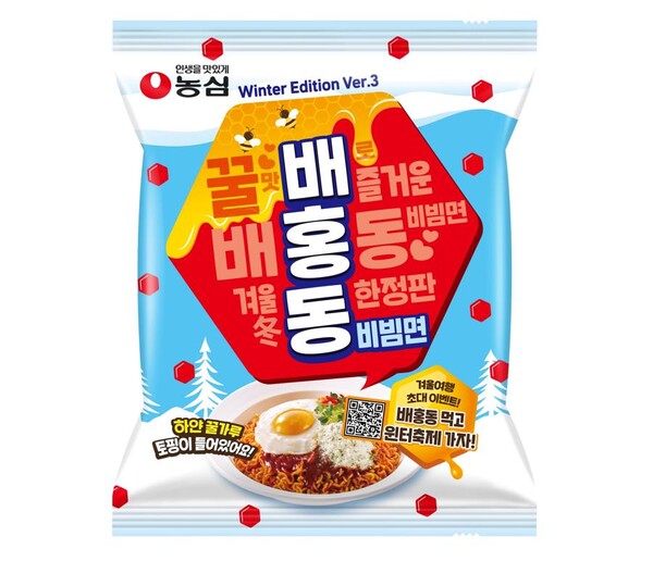 농심이 달콤한 꿀가루를 토핑으로 제공하는 겨울 시즌 한정판 ‘배홍동비빔면 윈터에디션’을 출시한다. 꿀가루 토핑으로 맛을 끌어올리고, 비빔면에 눈이 내린 듯한 모습을 연출한 제품이다.