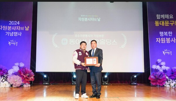 동아쏘시오홀딩스(대표이사 사장 김민영)는 지난 5일 동대문구가 실시한 자원봉사자의 날 기념식에서 ‘우수자원봉사자 기업부문’ 표창을 받았다고 6일 밝혔다.