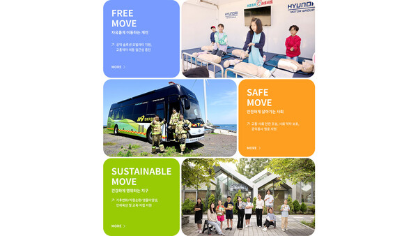메인 화면에서 스크롤을 내리면 현대자동차그룹의 CSR 3대 중점 영역인 ▲이동(Free Move) ▲안전(Safe Move) ▲친환경·미래세대(Sustainable Move)가 순서대로 나열되고, 각 배너를 클릭하면 영역별 대표 사회공헌 활동을 상세 페이지에서 확인할 수 있다.