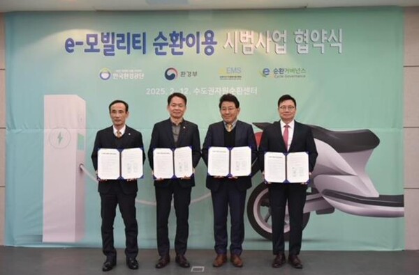[디지털비즈온 이은광 기자] 환경부 산하 한국환경공단(이사장 임상준)은 환경부, (사)한국전기이륜형자동차협회, E-순환거버넌스와 함께 12일 경기 용인시 ㈜수도권자원순환센터에서 ‘e-모빌리티 순환이용 시범사업’을 위한 업무협약을 체결했다고 밝혔다.