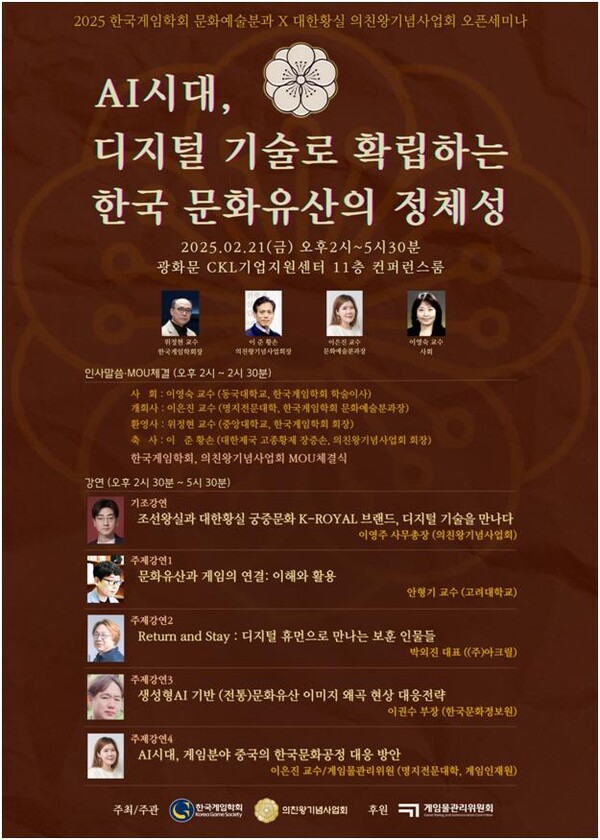 한국게임학회 문화예술분과(분과장 이은진)와 대한황실 의친왕기념사업회(회장 이 준) 공동주최의 ‘AI 시대, 디지털 기술로 확립하는 한국 문화유산의 정체성’을 주제로 한 오픈세미나가 오는 21일 (금) 오후2시부터 5시 30분까지 광화문 한국콘텐츠진흥원 CKL기업지원센터 11층 컨퍼런스룸에서 열린다.