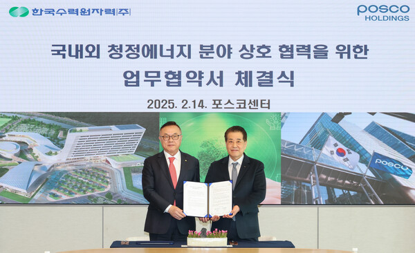 한국수력원자력(사장 황주호, 이하 한수원)은 14일 서울 포스코센터에서 포스코홀딩스와 국내외 청정에너지 분야 상호 협력을 위한 업무협약서(MOU)를 체결했다. 이날 행사에는 한수원 황주호 사장, 포스코그룹 장인화 회장 등 양사 주요 인사들이 참석했다.