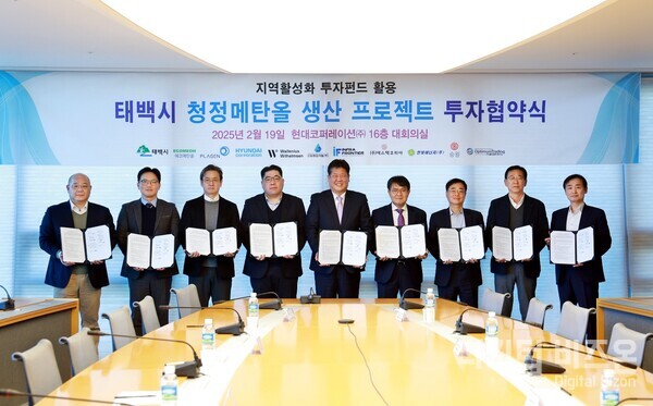 [디지털비즈온 이은광 기자] 태백시(시장 이상호)와 ㈜플라젠을 포함한 11개 기관은 2월 19일 16시, 현대코퍼레이션 11층 대회의실에서 지역활성화펀드를 활용한 청정메탄올 생산 프로젝트를 위한 투자 협약식을 개최하였다. 이번 협약으로 2025년 상반기 태백시 동점산업단지에 착공하여 2027년 하반기부터 연간 1만톤의 청정메탄올을 생산할 계획이라고 밝혔다.