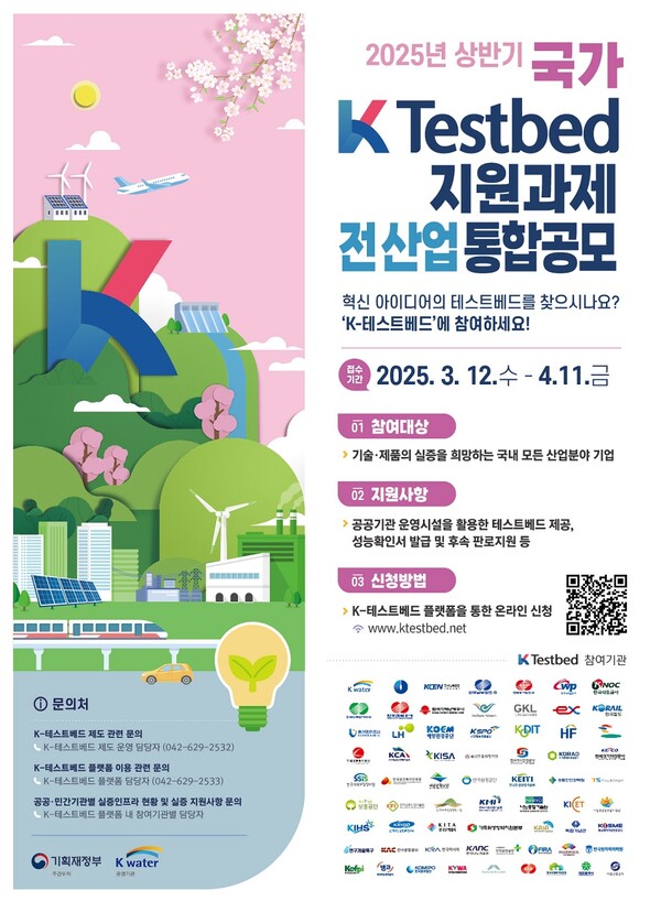한국수자원공사(K-water)는 혁신 기술을 보유한 국내 유망 중소·벤처기업의 육성을 위해 2025년 상반기 K-테스트베드 지원사업에 참여할 기업을 3월 12일부터 4월 11일까지 모집한다.